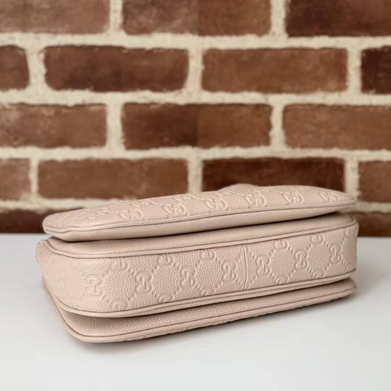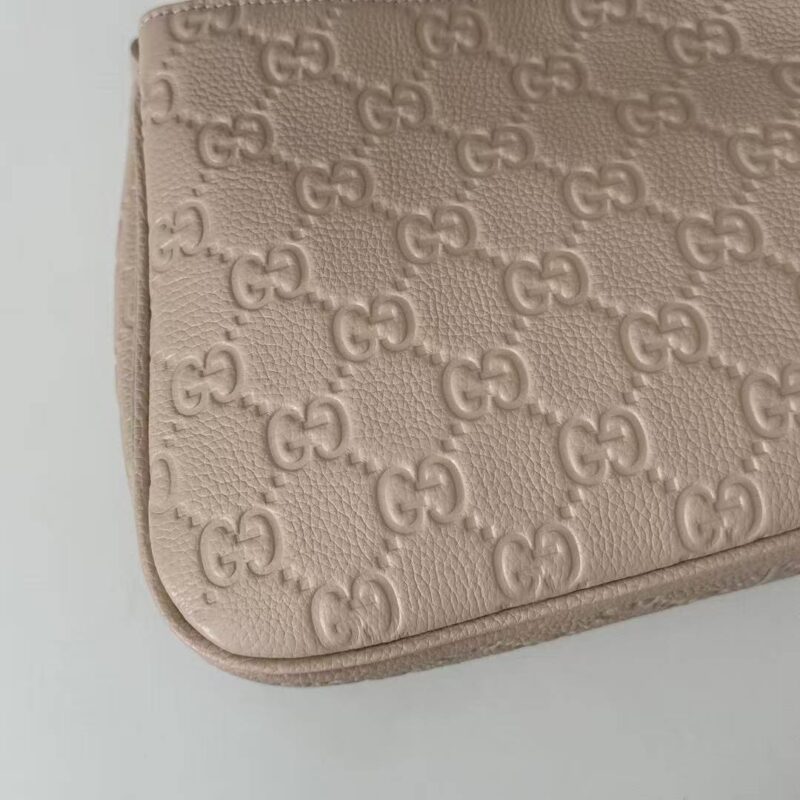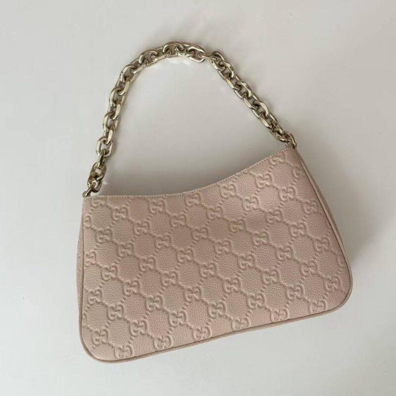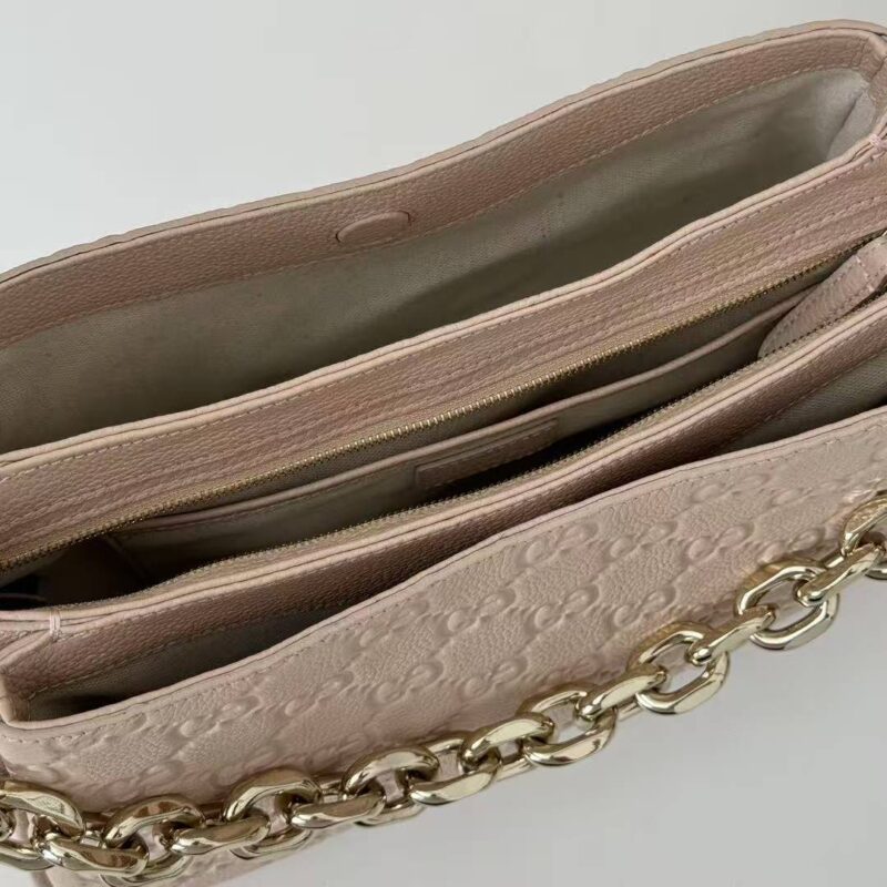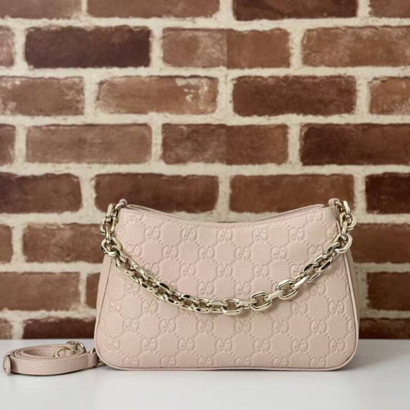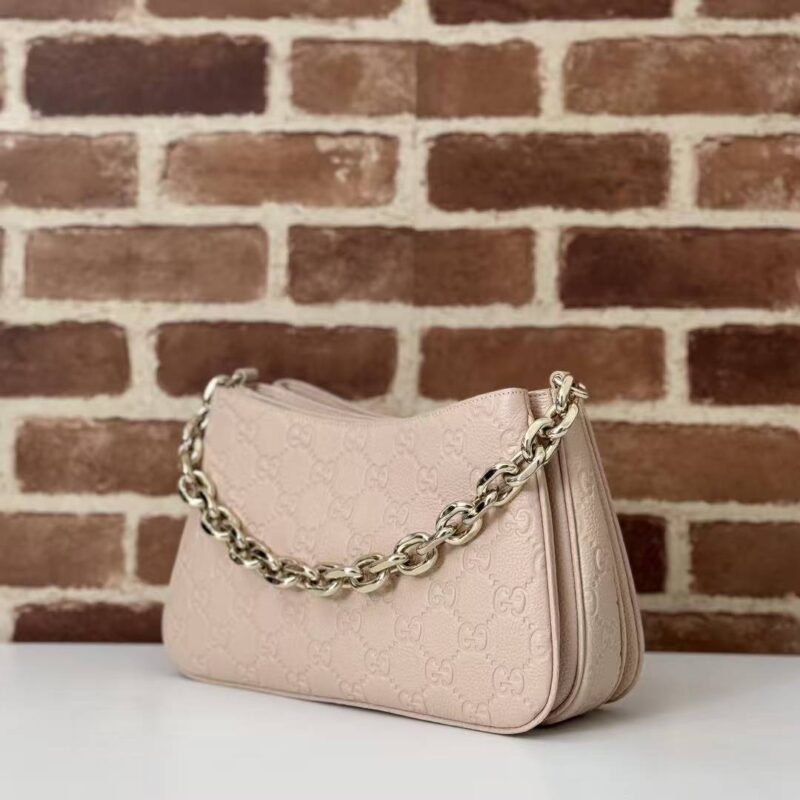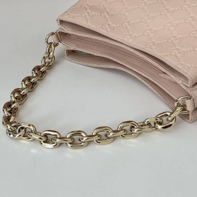 Nude Pink Elegance | Gucci GG Embossed Shoulder Bag Crafted from embossed calfskin with iconic Guccissima monogram Thick gold chain + detachable long strap, perfect for shoulder or crossbody wear Soft nude pink hue, versatile for all outfits, ideal for commuting & dating