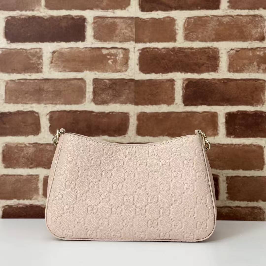 Nude Pink Elegance | Gucci GG Embossed Shoulder Bag Crafted from embossed calfskin with iconic Guccissima monogram Thick gold chain + detachable long strap, perfect for shoulder or crossbody wear Soft nude pink hue, versatile for all outfits, ideal for commuting & dating