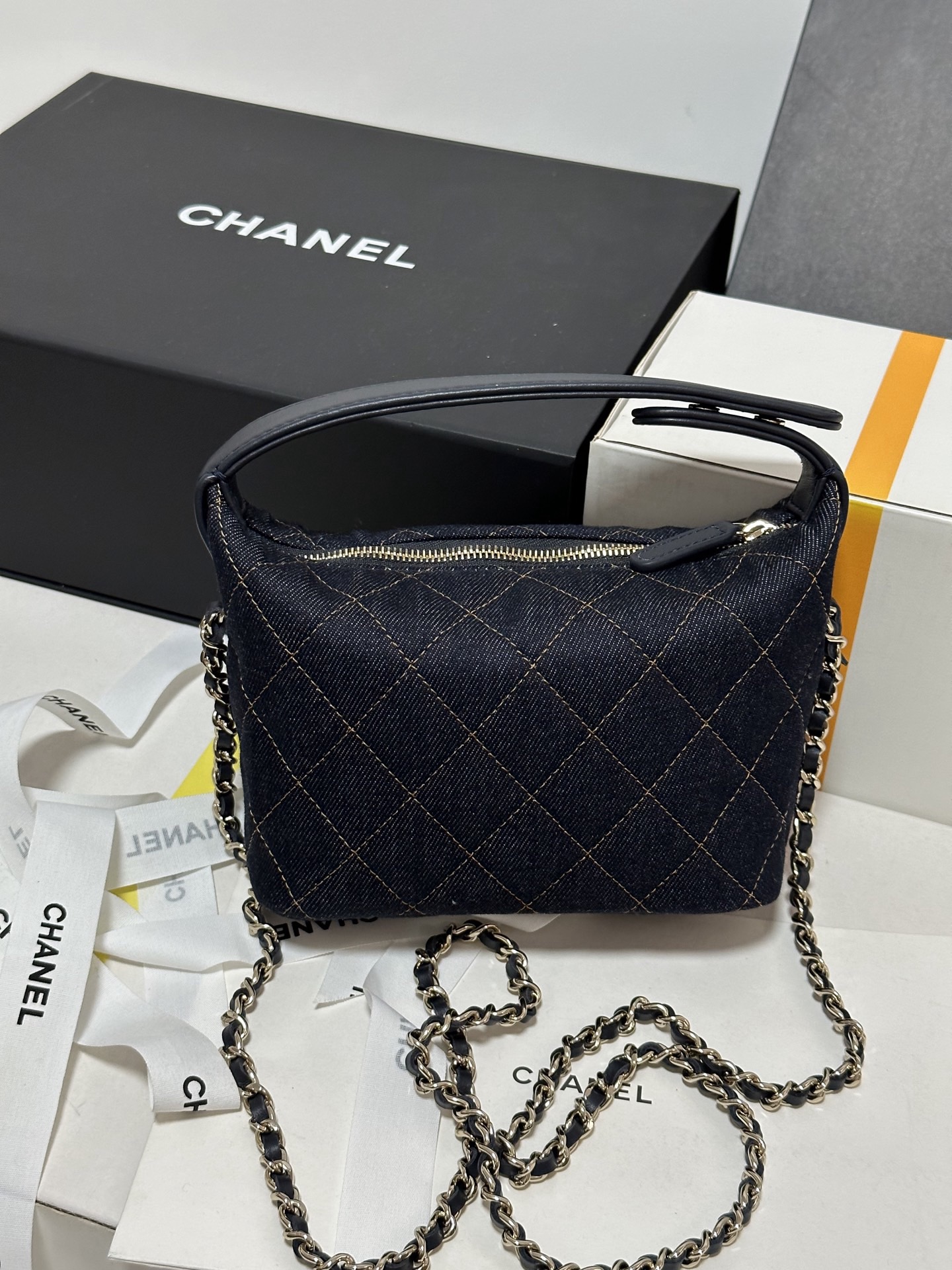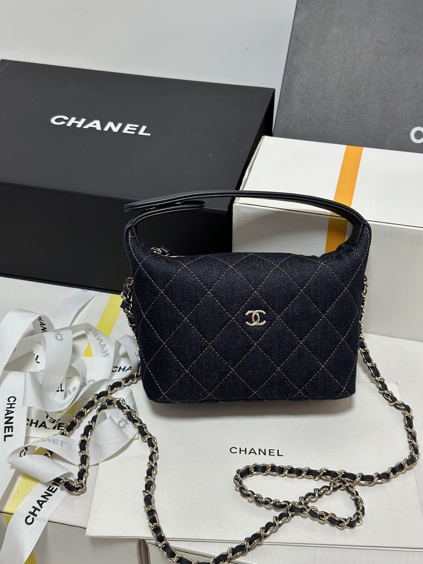 • Timeless Design Fusion: Featuring the iconic diamond-quilted stitching and interlocking CC gold metal logo, this bag embodies Chanel’s timeless DNA. Crafted from dark denim denim with bright yellow contrast stitching, it exudes a vintage charm with a relaxed, casual vibe.