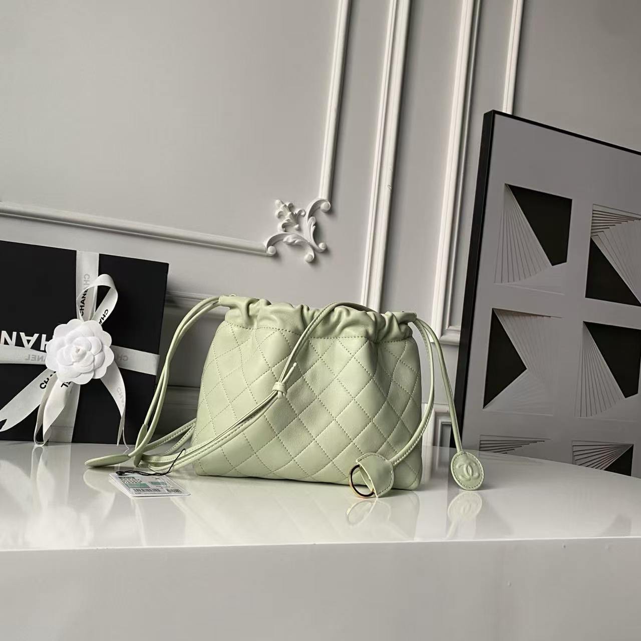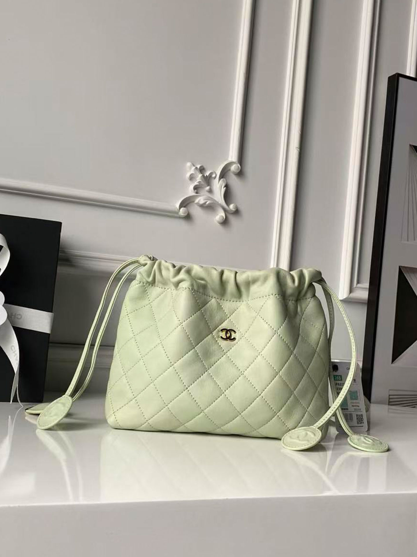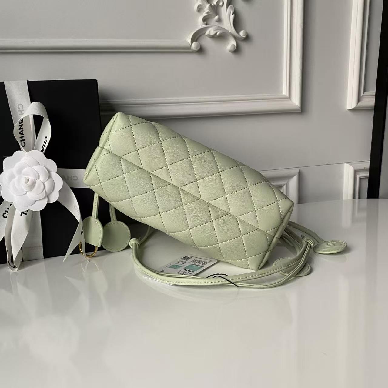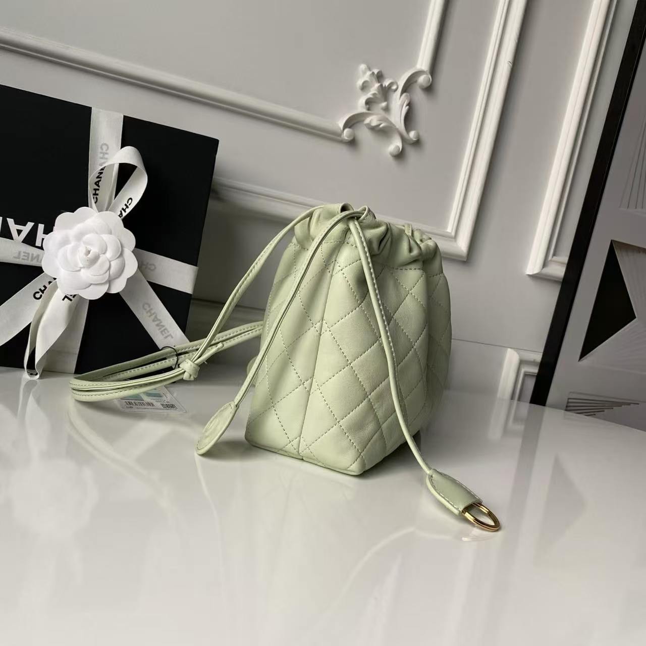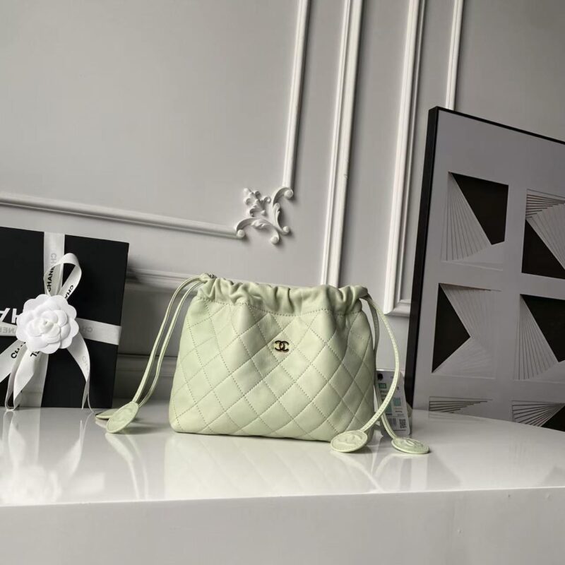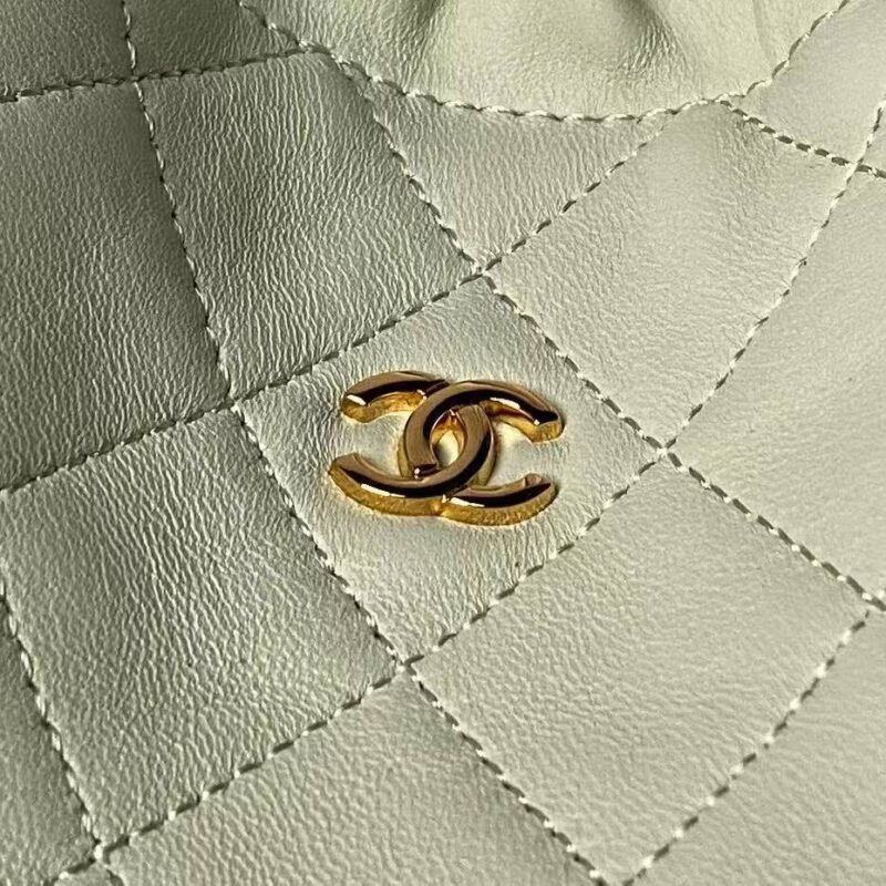 • Drawstring Closure: Two long lambskin drawstrings with circular leather tabs (embossed with the CC logo) to cinch the bag’s opening, adding a playful, adjustable detail.
