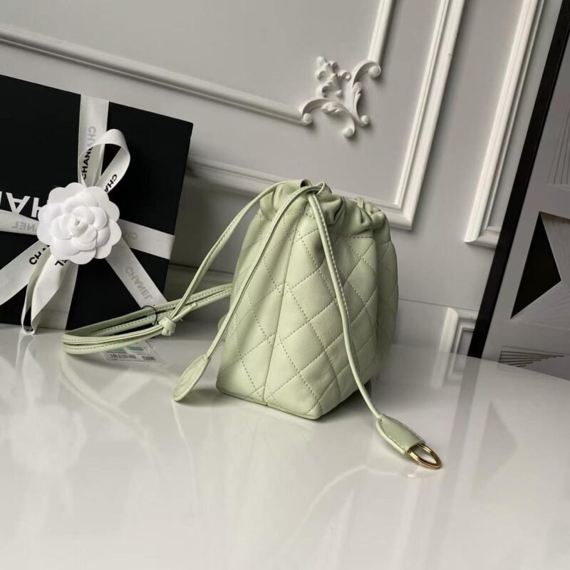 Crafted from buttery-soft lambskin with iconic diamond quilting, finished with polished gold-tone CC hardware and adjustable drawstring straps.