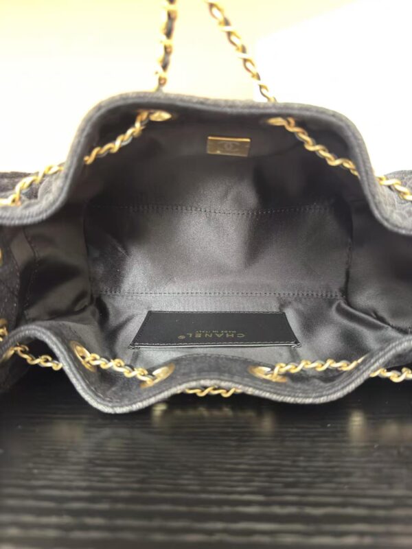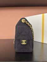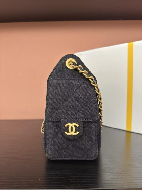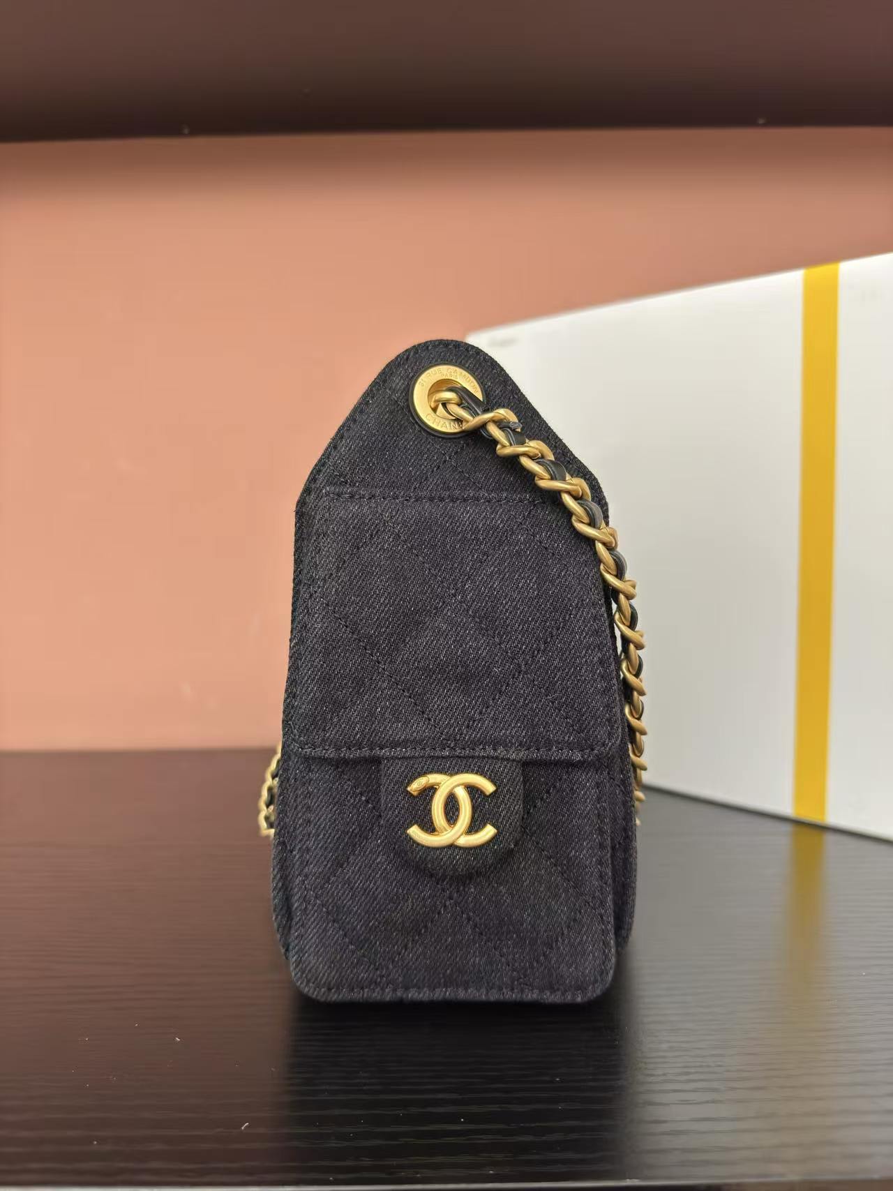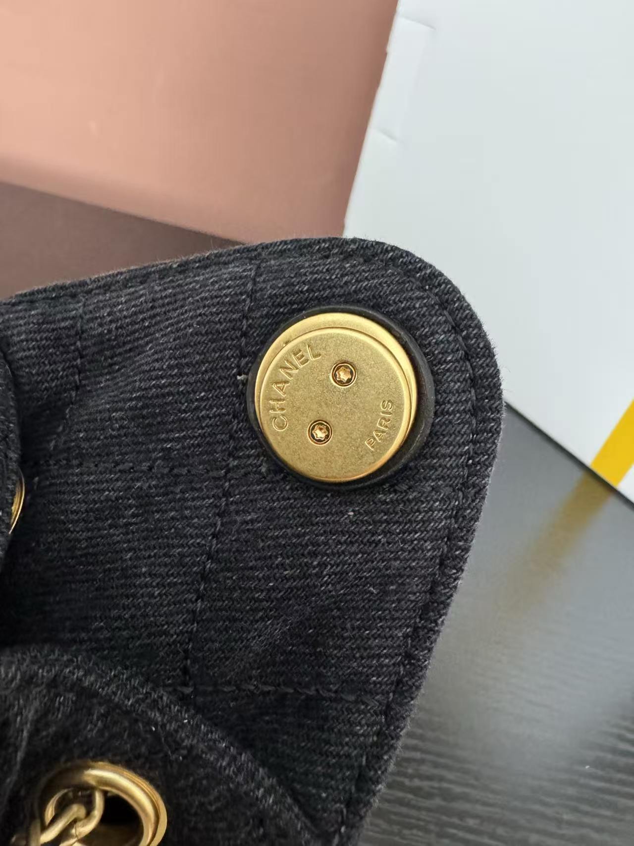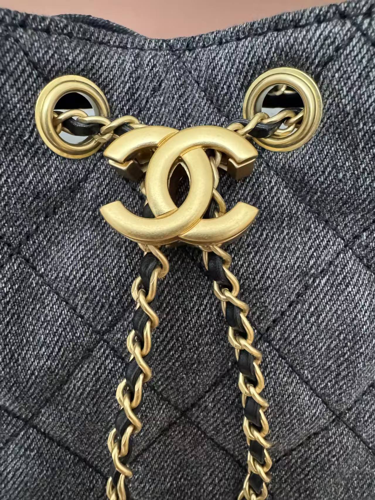 - Hardware: Antique Gold-Tone metal hardware, including the front Interlocking CC turn-lock, drawstring chain, and side snap buttons. The vintage finish perfectly complements the denim material, enhancing the retro aesthetic.