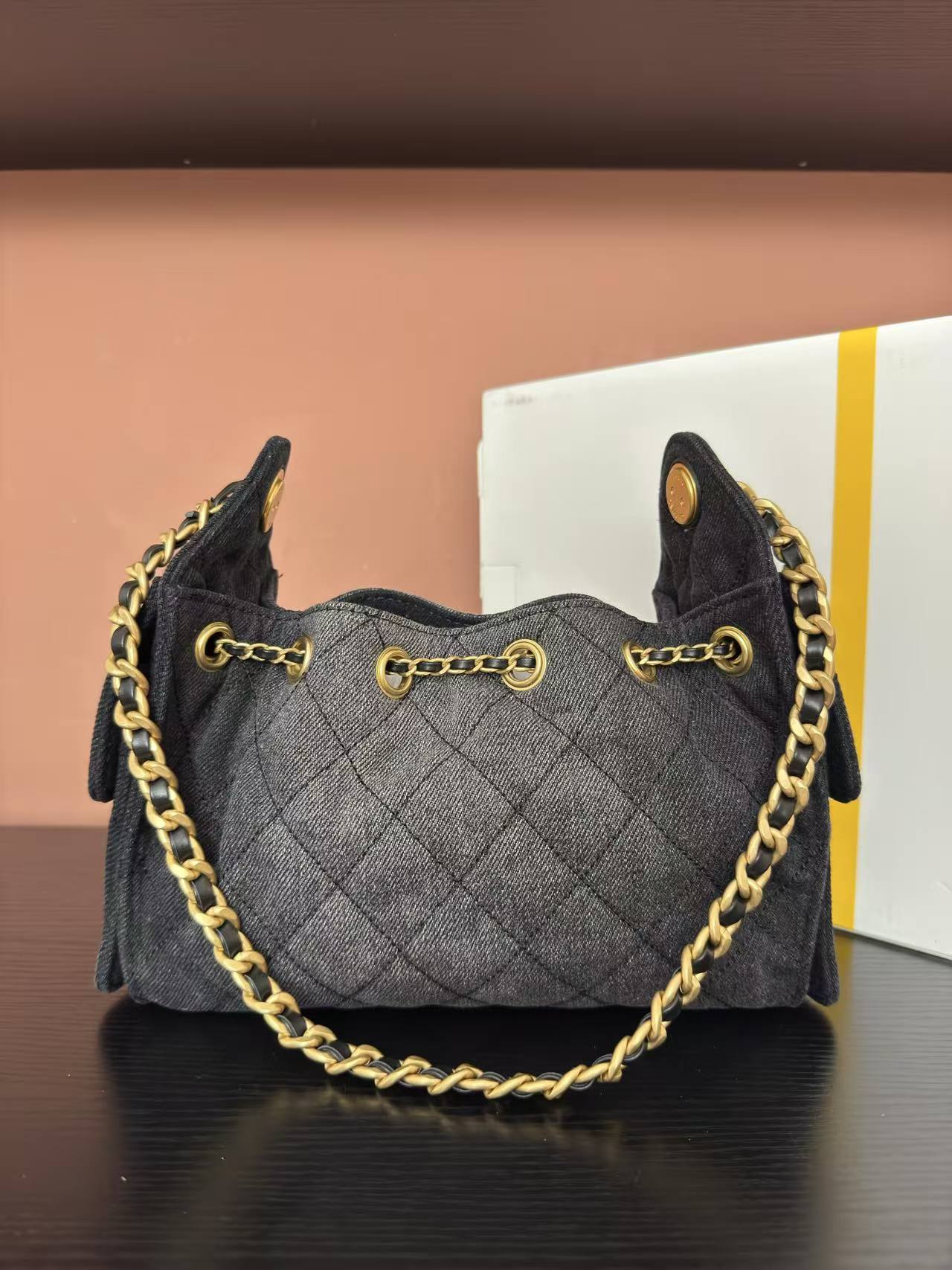 This is the Hippie Bag (HOBO bag) from the Chanel 2023 Spring/Summer (23C) collection. It is made mainly from vintage denim fabric and has become a highly popular and trendy item in the recent casual fashion trend.