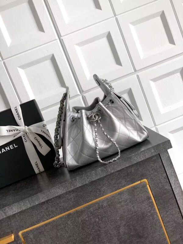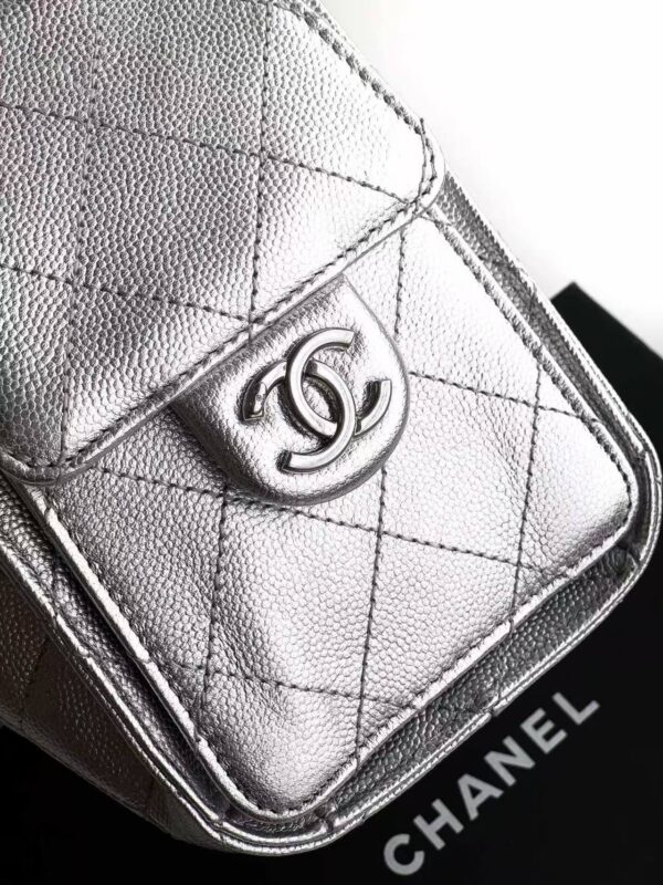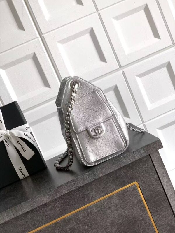 - Material & Craftsmanship: The bag is crafted from silver grained calfskin (荔枝纹牛皮), with Chanel’s signature quilted diamond pattern stitched across the body. The metallic silver finish gives the bag a sleek, futuristic glow, while the grained texture adds durability and a luxurious tactile feel.