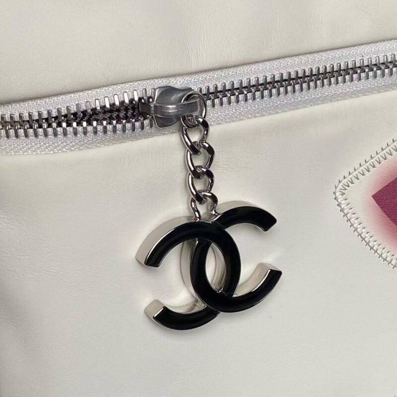 - A silver metal zipper runs across the middle of the bag, with a double C-shaped metal charm attached to the zipper pull, enhancing both design detail and the security of the bag’s contents.