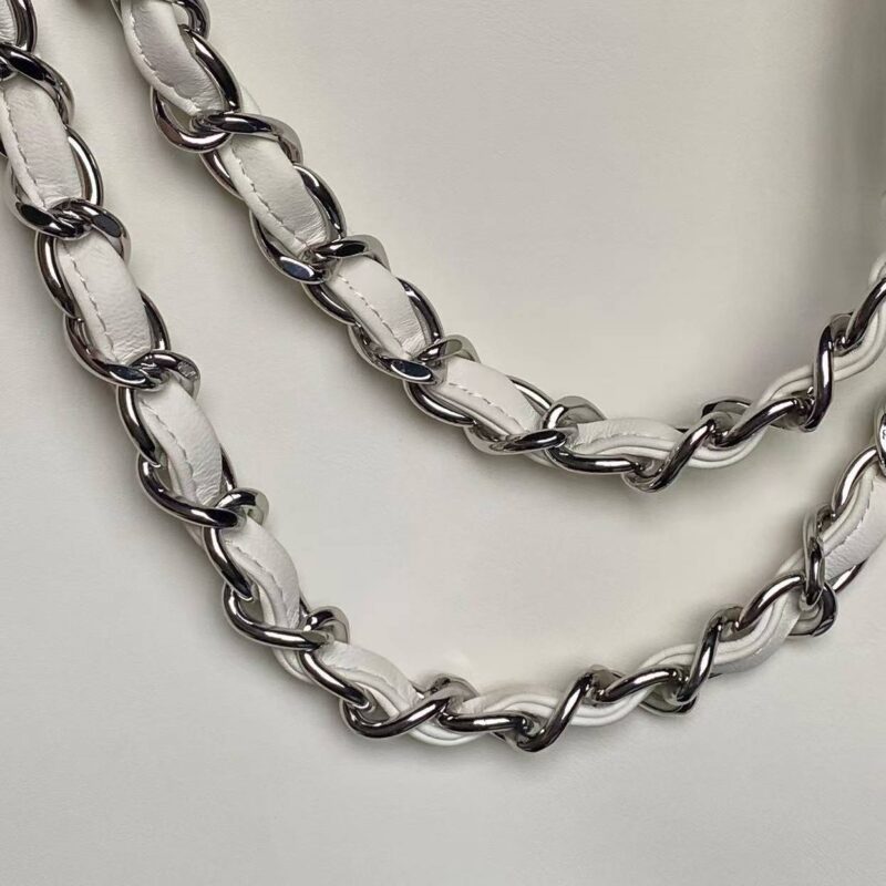 - The shoulder strap is Chanel’s signature leather-woven metal chain (silver chain with cream white leather threading), combining decoration and practicality for shoulder or hand carry.