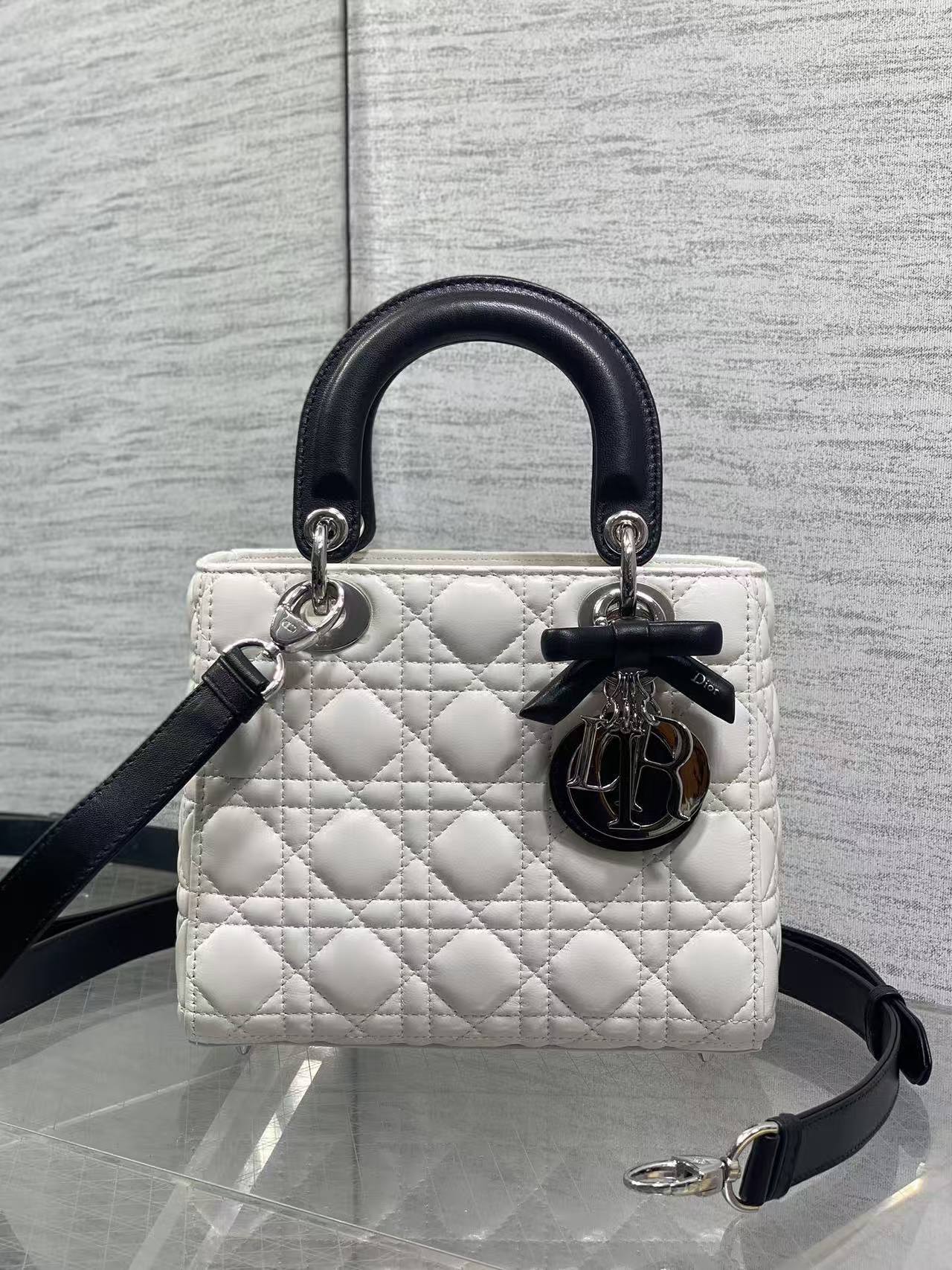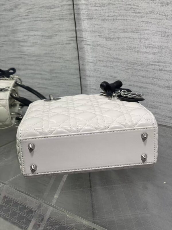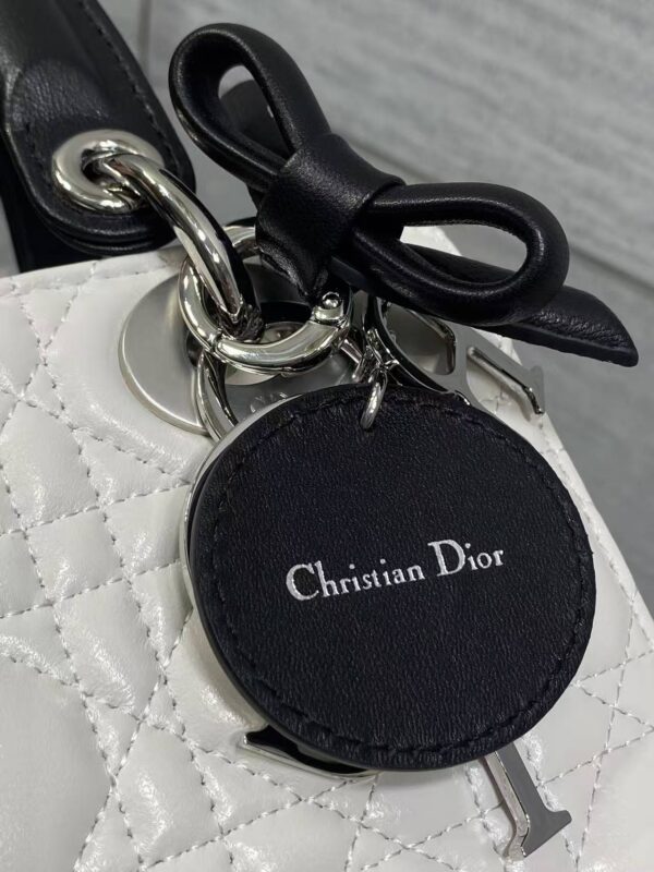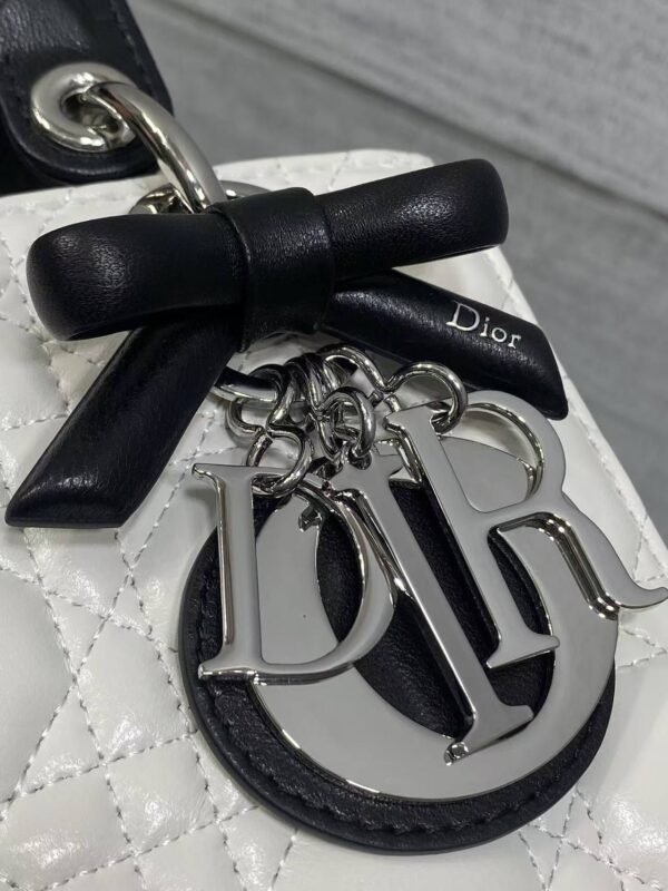 Iconic Charms: The handle is adorned with Dior’s classic D.I.O.R. letter charms and a black satin bow printed with the “Dior” logo. The metallic charms are polished to a bright silver finish, delivering exquisite detailing.