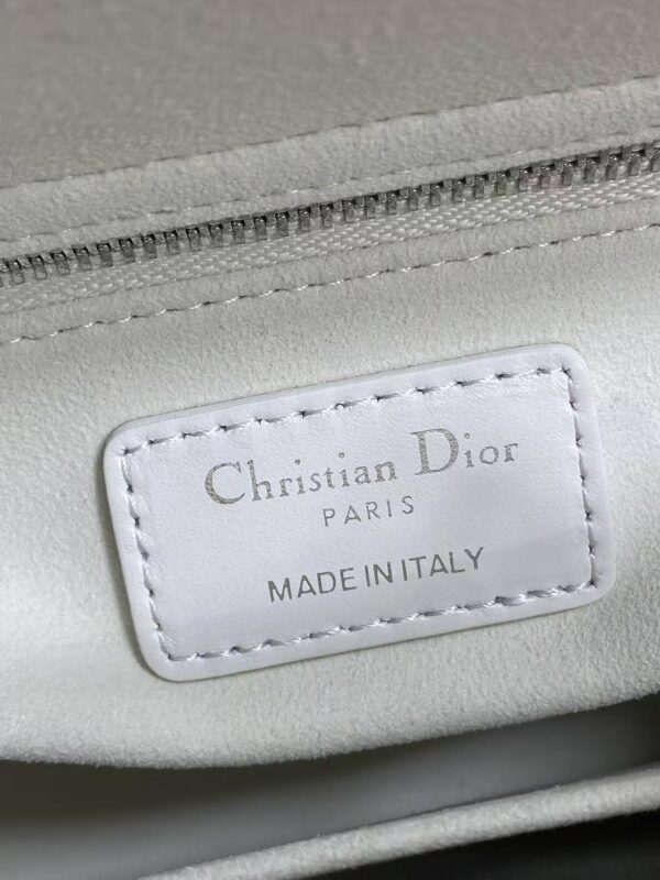 Cannage Quilting: Crafted from white lambskin, the bag features Dior’s signature cannage stitching, creating plump, three-dimensional diamond quilting. This is the most recognizable design element of the Lady Dior and a symbol of the brand’s artisanal craftsmanship.