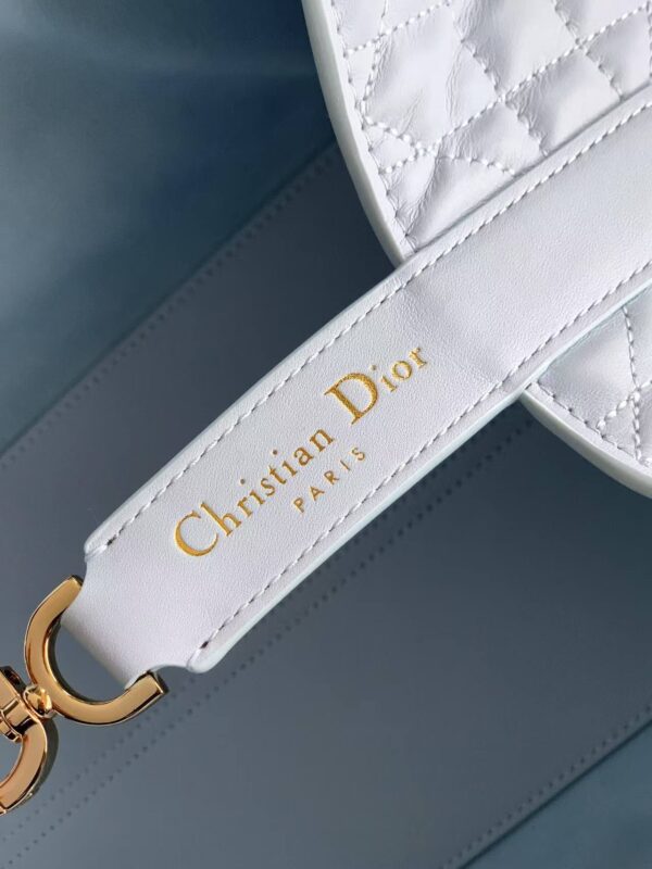 The bag’s body is crafted with Dior’s legendary Cannage (diamond-quilted) stitching, the house’s instantly recognizable signature motif. The voluminous, puffy quilting creates a soft, cloud-like silhouette while maintaining exceptional structure, elevating the bag’s timeless luxury.
