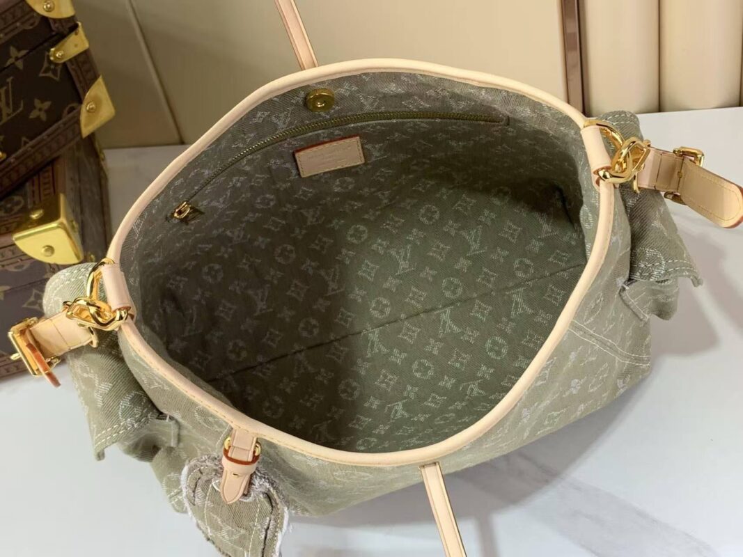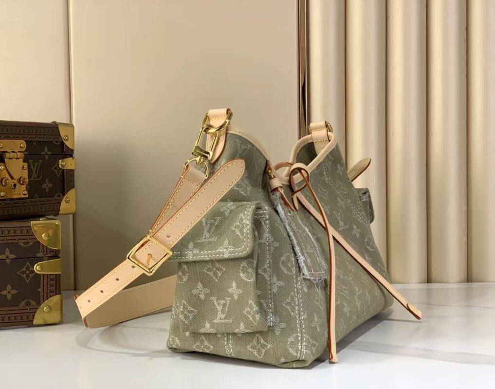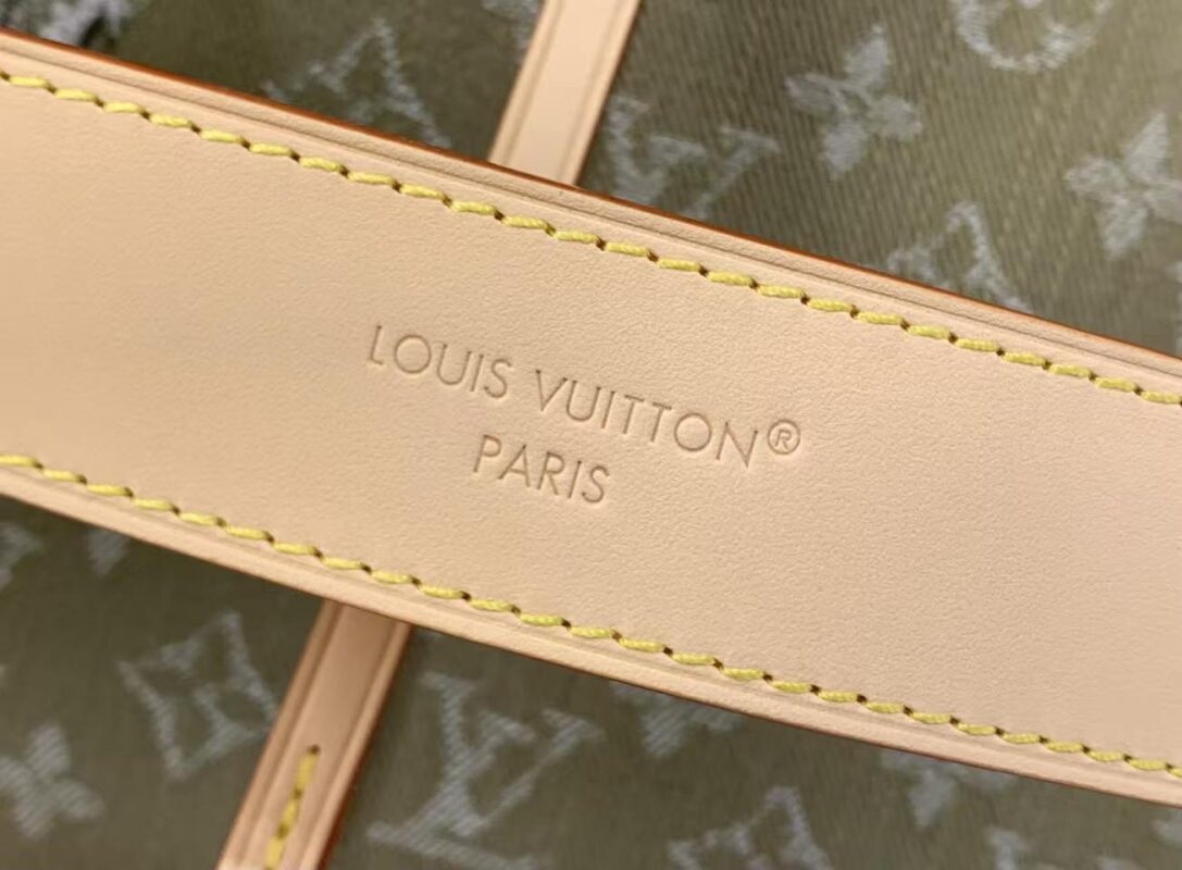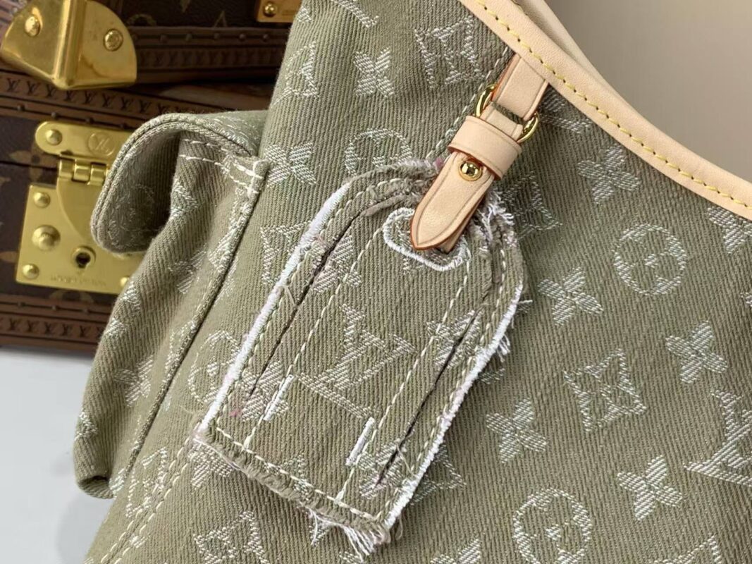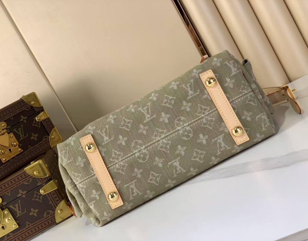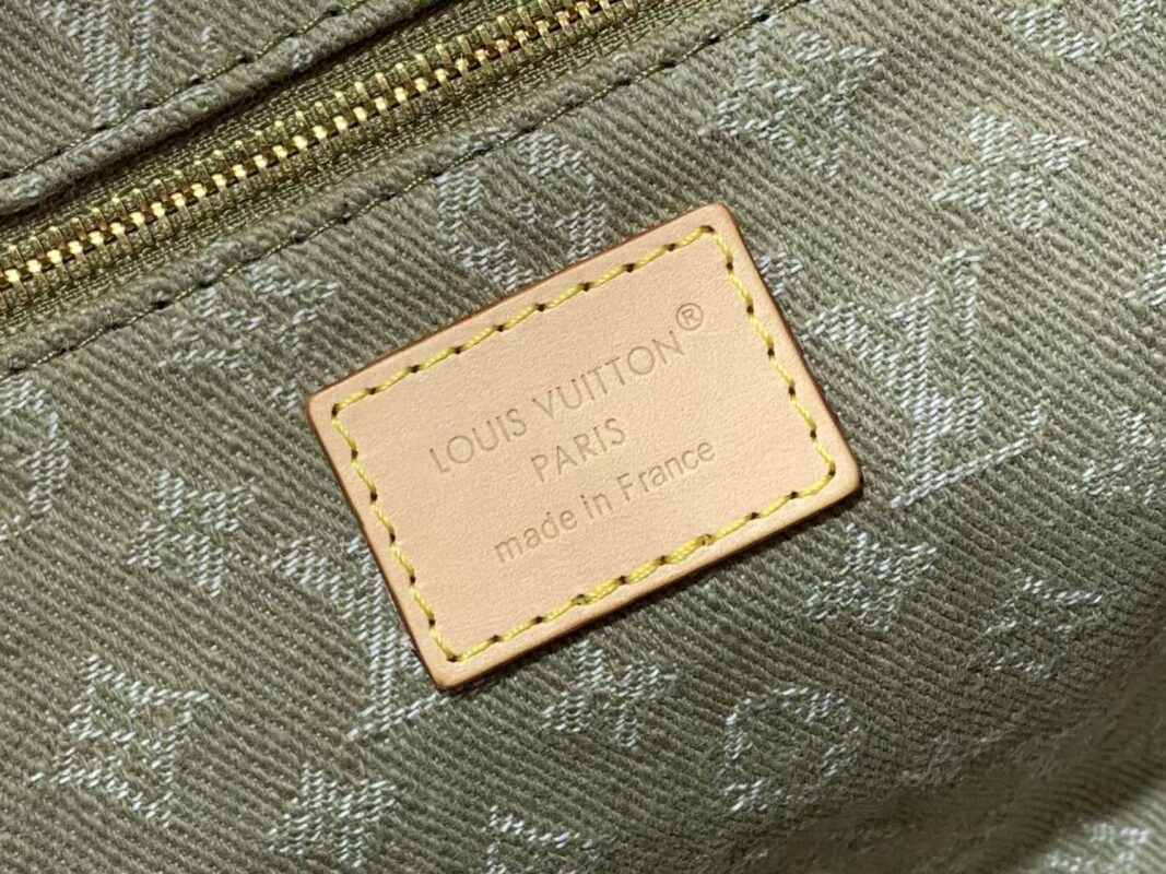 - Bag Body: Crafted from olive green washed denim canvas, printed with LV’s iconic Monogram pattern (featuring signature LV initials, four-leaf clovers, and star motifs). The faded, worn-in finish embodies the popular retro aesthetic of recent seasons.