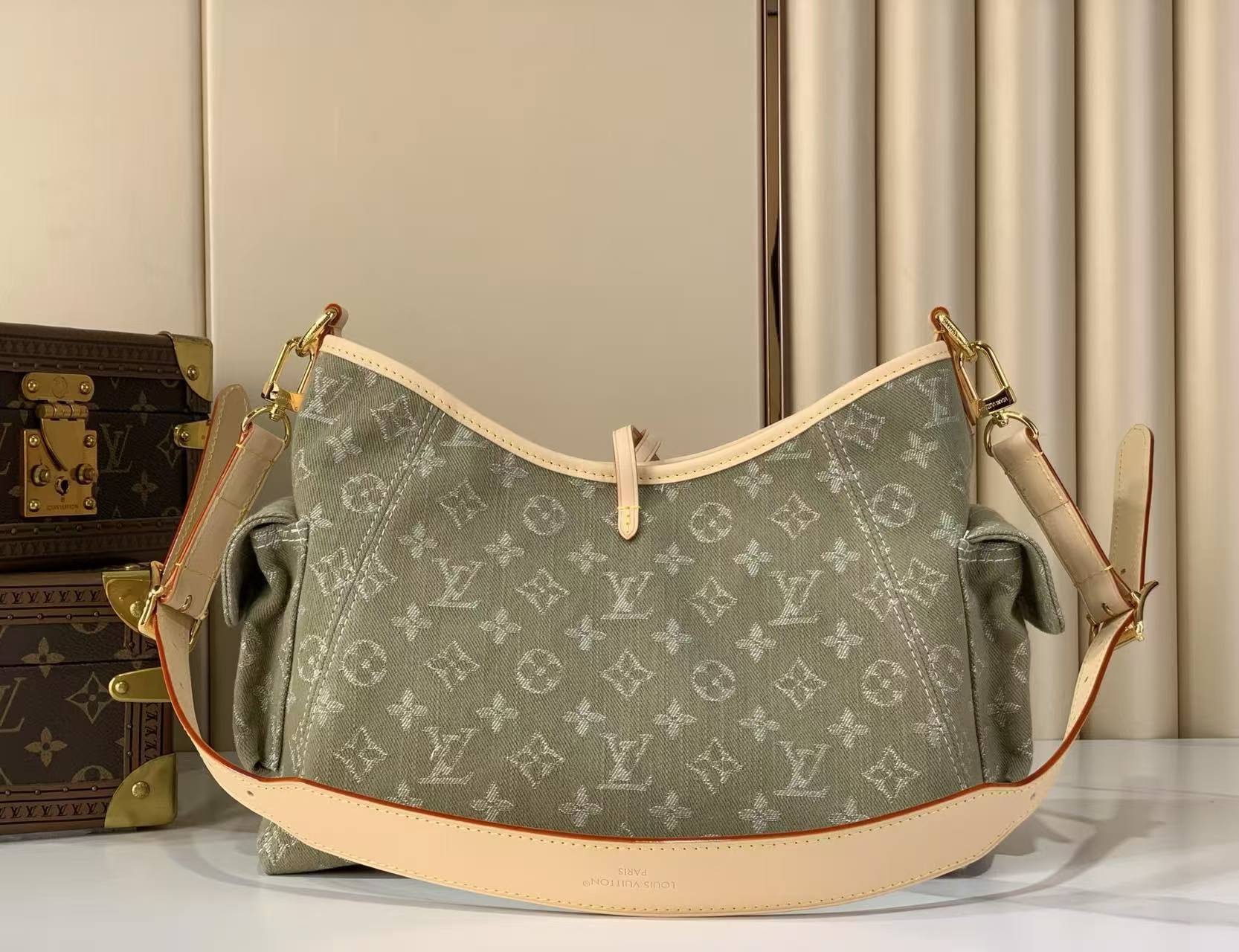 - Bag Body: Crafted from olive green washed denim canvas, printed with LV’s iconic Monogram pattern (featuring signature LV initials, four-leaf clovers, and star motifs). The faded, worn-in finish embodies the popular retro aesthetic of recent seasons.