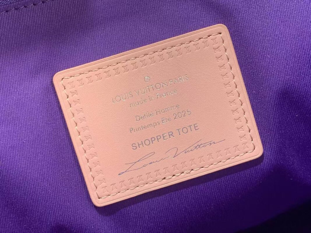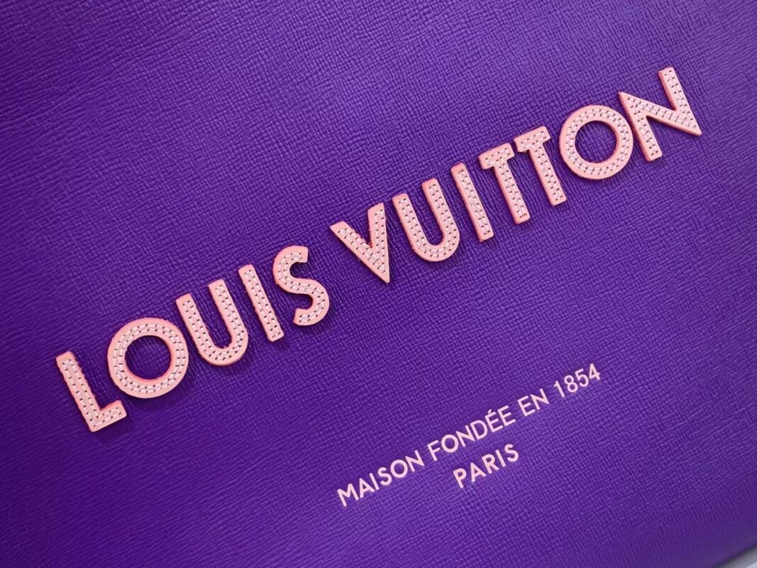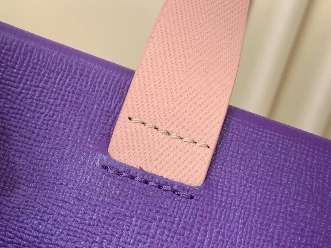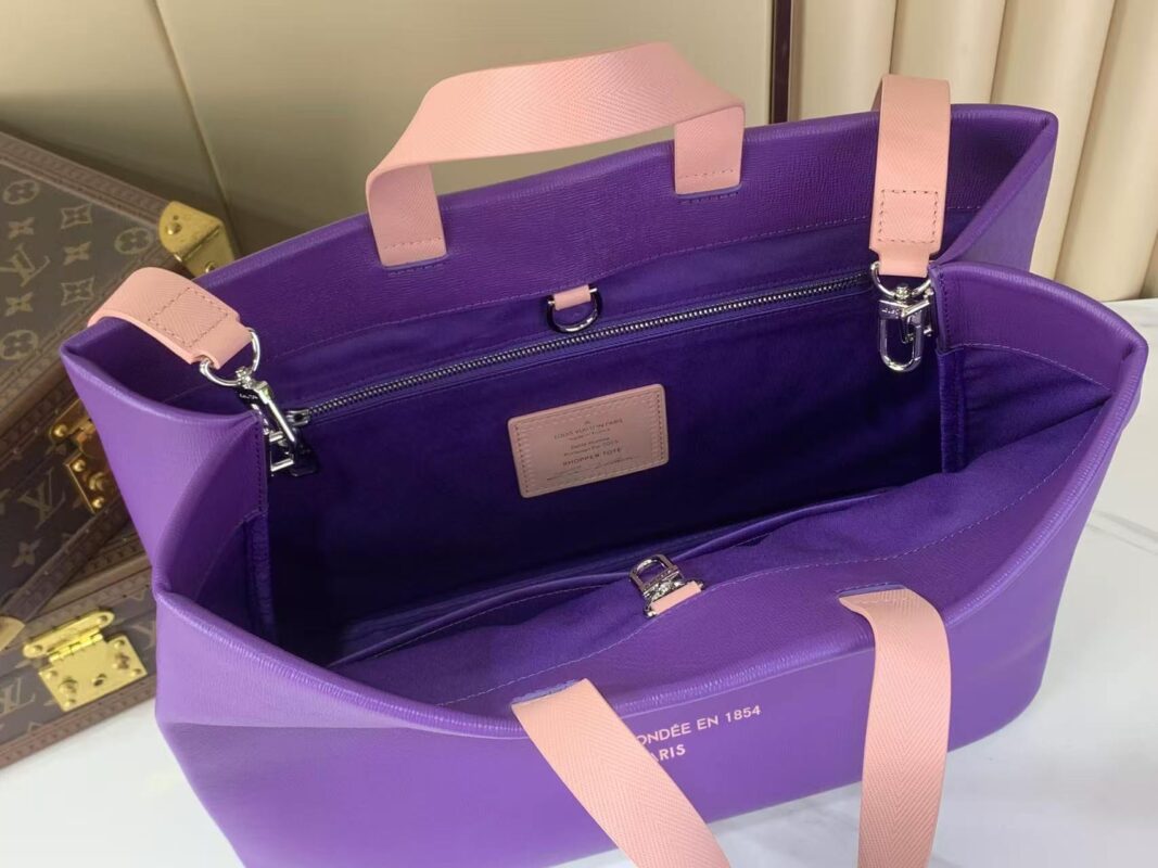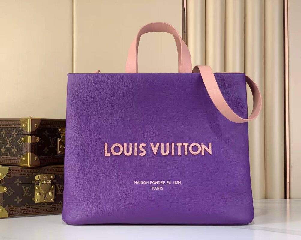 This Louis Vuitton leather tote reimagines the classic tote silhouette with a showstopping violet and blush pink colorway.Crafted from premium grained calfskin, featuring a perforated 3D LV logo and the iconic “Maison Fondée en 1854 Paris” signature.With dual top handles and a detachable shoulder strap, it’s the ultimate blend of bold style and everyday functionality.A must-have statement piece for the modern luxury lover.