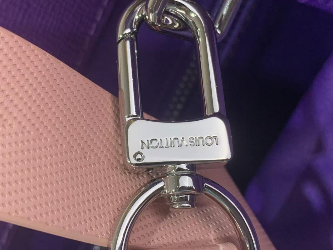 • Accents & Hardware: Contrasting blush pink (rose poudre) leather for the top handles and detachable shoulder strap, creating a bold, playful color block. The iconic “LOUIS VUITTON” lettering on the front is crafted from the same pink leather with a perforated detail, adding a premium 3D effect.