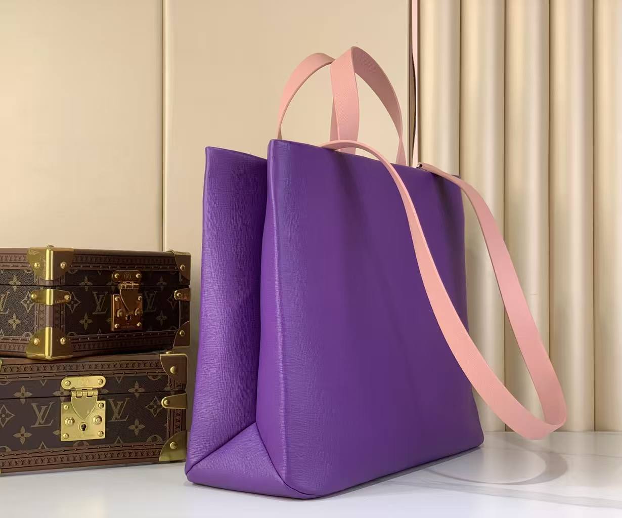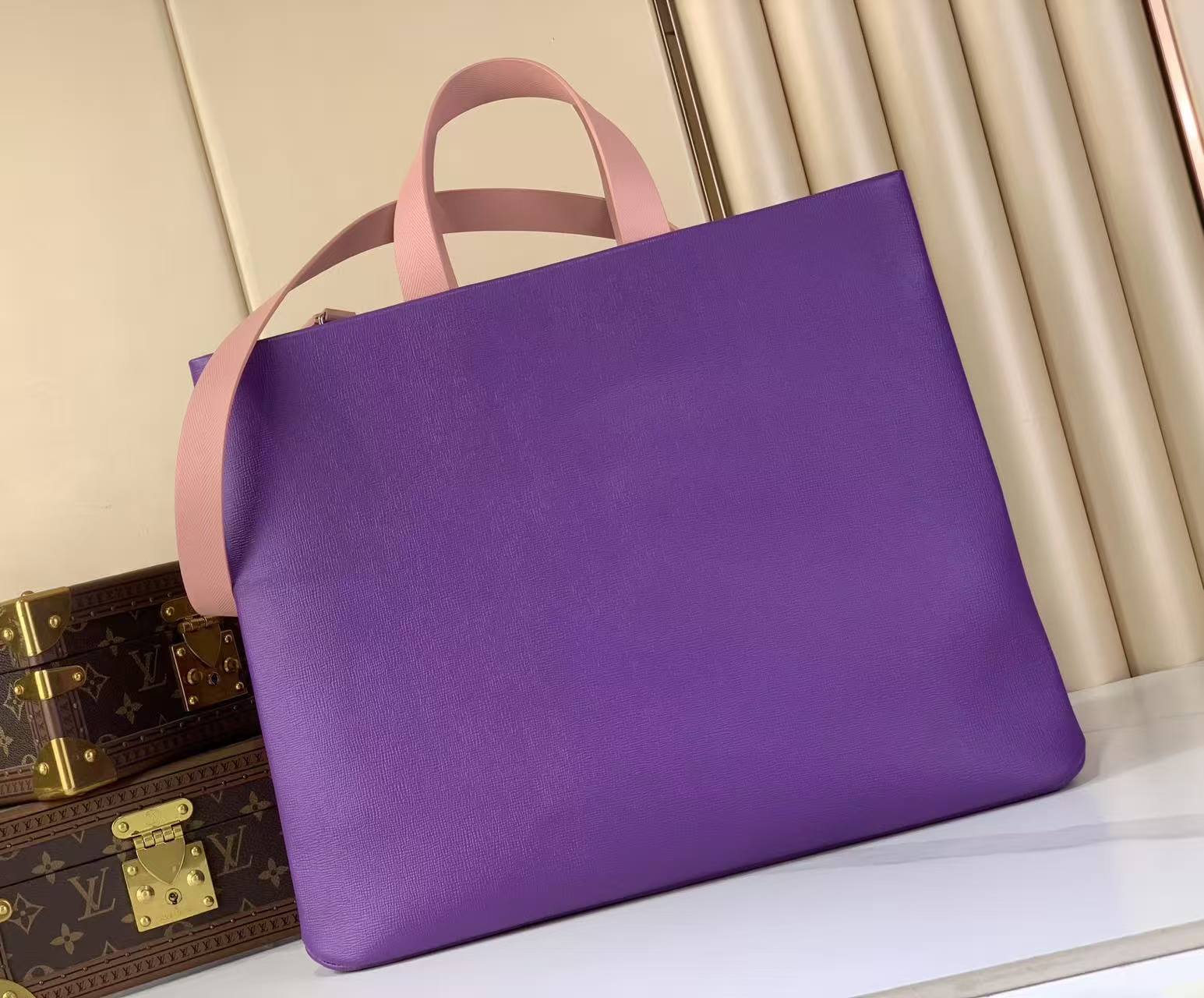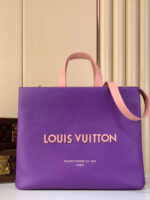 This Louis Vuitton leather tote reimagines the classic tote silhouette with a showstopping violet and blush pink colorway.Crafted from premium grained calfskin, featuring a perforated 3D LV logo and the iconic “Maison Fondée en 1854 Paris” signature.With dual top handles and a detachable shoulder strap, it’s the ultimate blend of bold style and everyday functionality.A must-have statement piece for the modern luxury lover.