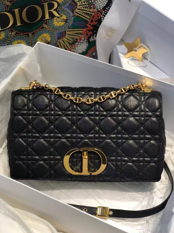 Dior Caro Black Gold Cannage Quilted Lambskin Chain Bag An iconic Dior staple, crafted with signature Cannage quilting and supple grained lambskin. The timeless black and gold finish exudes understated luxury, while the versatile chain strap offers multiple carrying styles. A must-have timeless piece for every luxury lover, perfect for commuting, dating and daily styling.