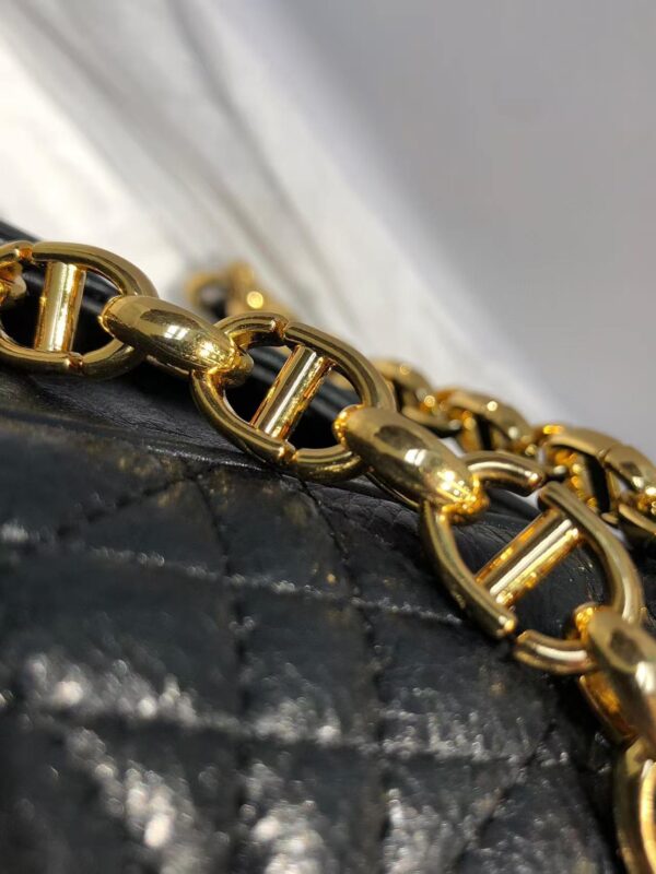 At the center of the front flap sits Dior’s instantly recognizable gold-tone CD logo clasp, the ultimate symbol of the brand’s heritage and luxury. The top chain strap is also intricately designed with integrated CD motifs, adding a subtle, elevated detail that ties the entire piece together.